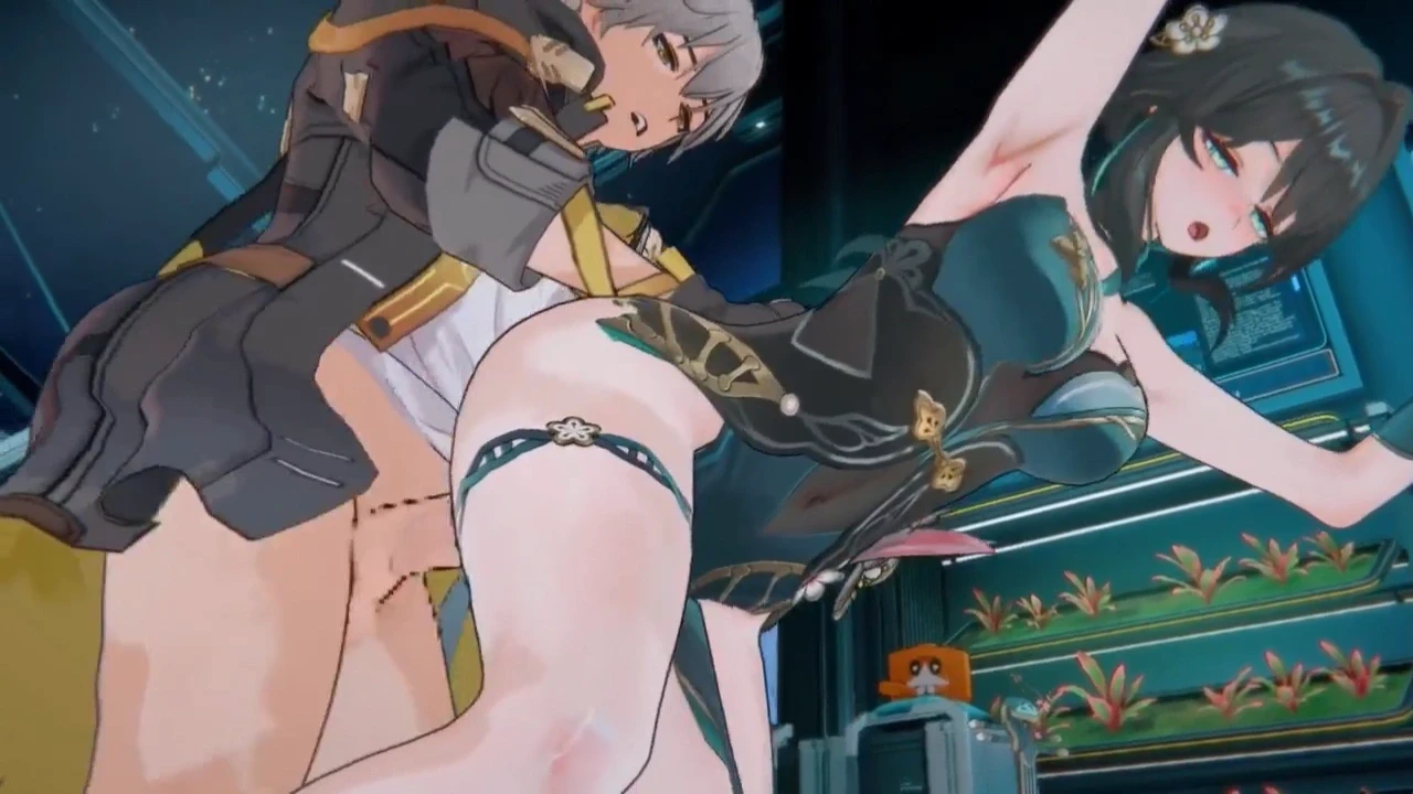 Ruan Mei de Honkai: Star Rail recibe nalgadas y Caelus se la coge por detrás mientras ella se inclina hacia adelante contra la pared. Caelus la agarra de las caderas, dándole duro mientras sus tetas rebotan y ella gime, aún con la ropa apartada.