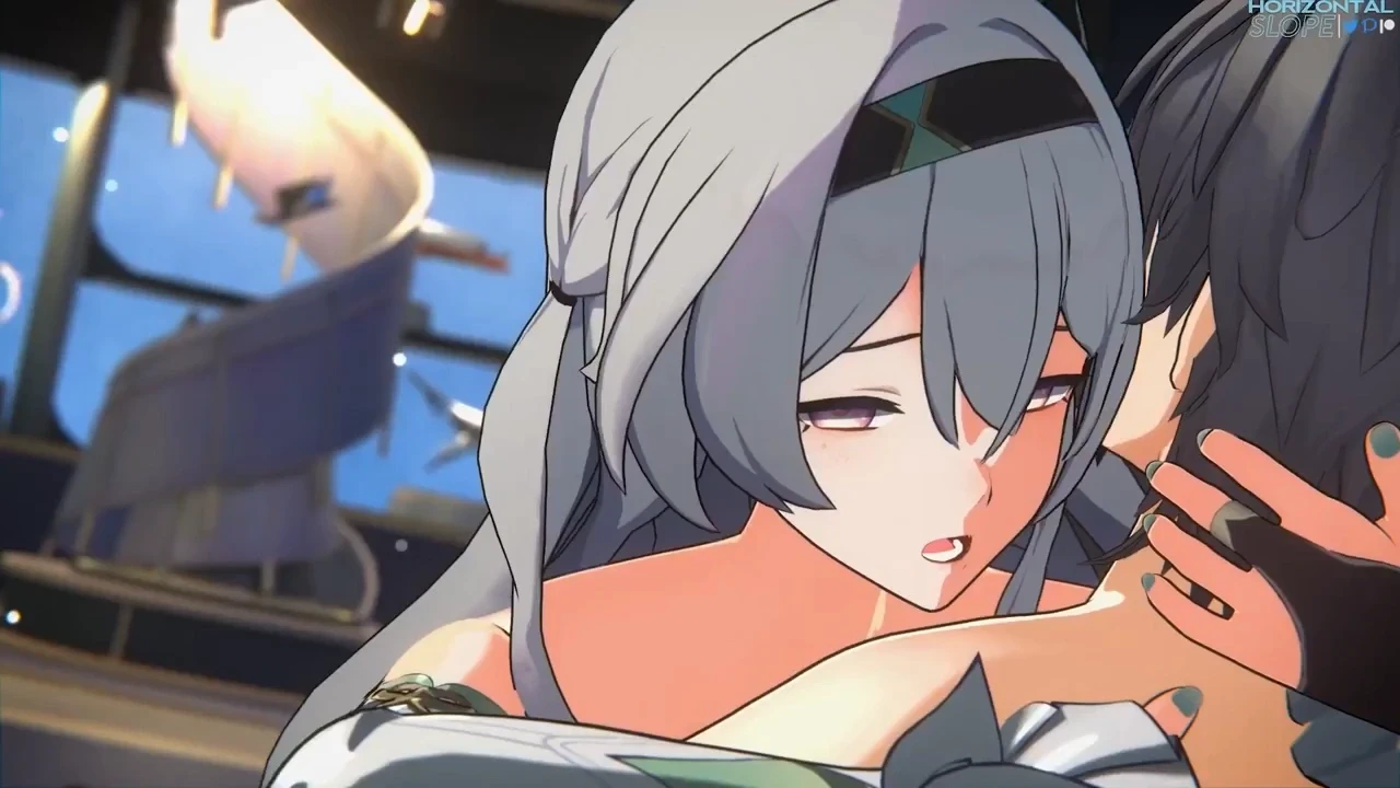 Firefly from Honkai: Star Rail is fully naked, straddling Caelus and bouncing on his cock in bed, grabbing his shoulders while he holds her ass and fucks her hard until she cums and his load leaks out of her pussy.